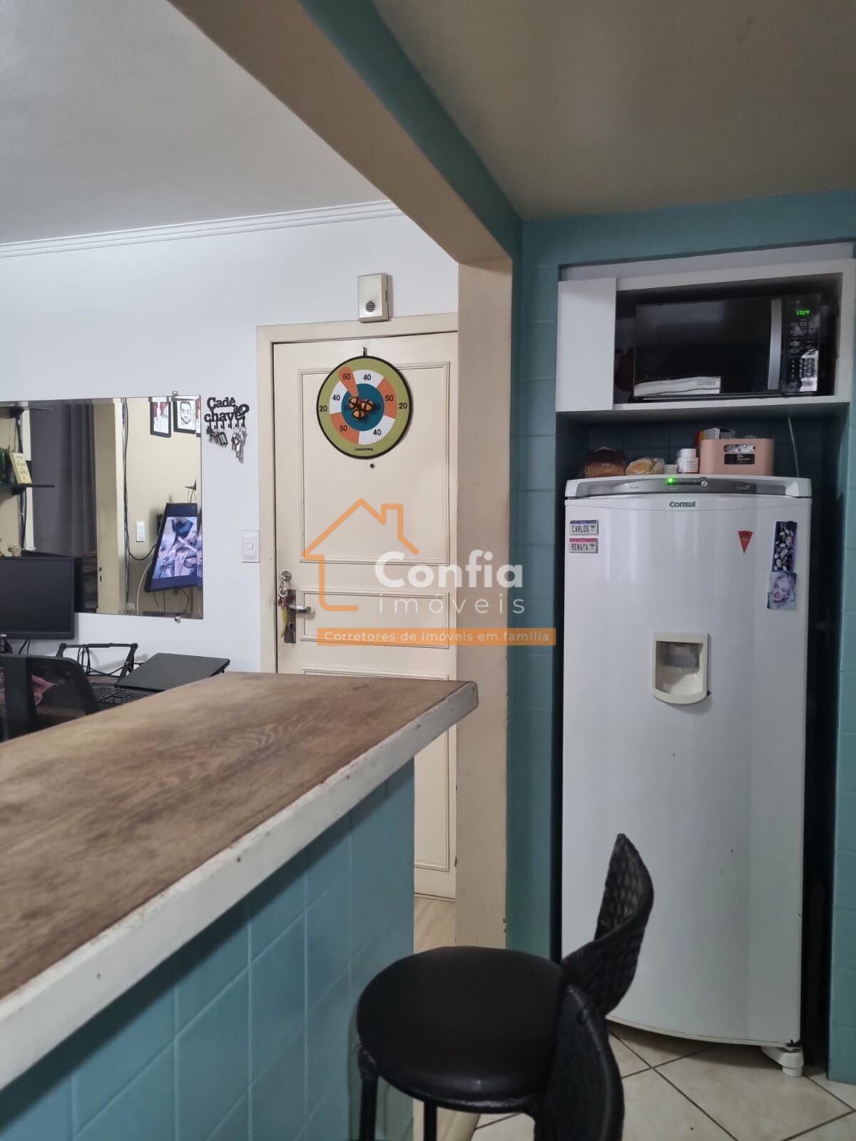 Apartamento dividido entre os ambientes: Sala de Estar/TV; Um Quarto, Banheiro; Cozinha; Área de serviço;